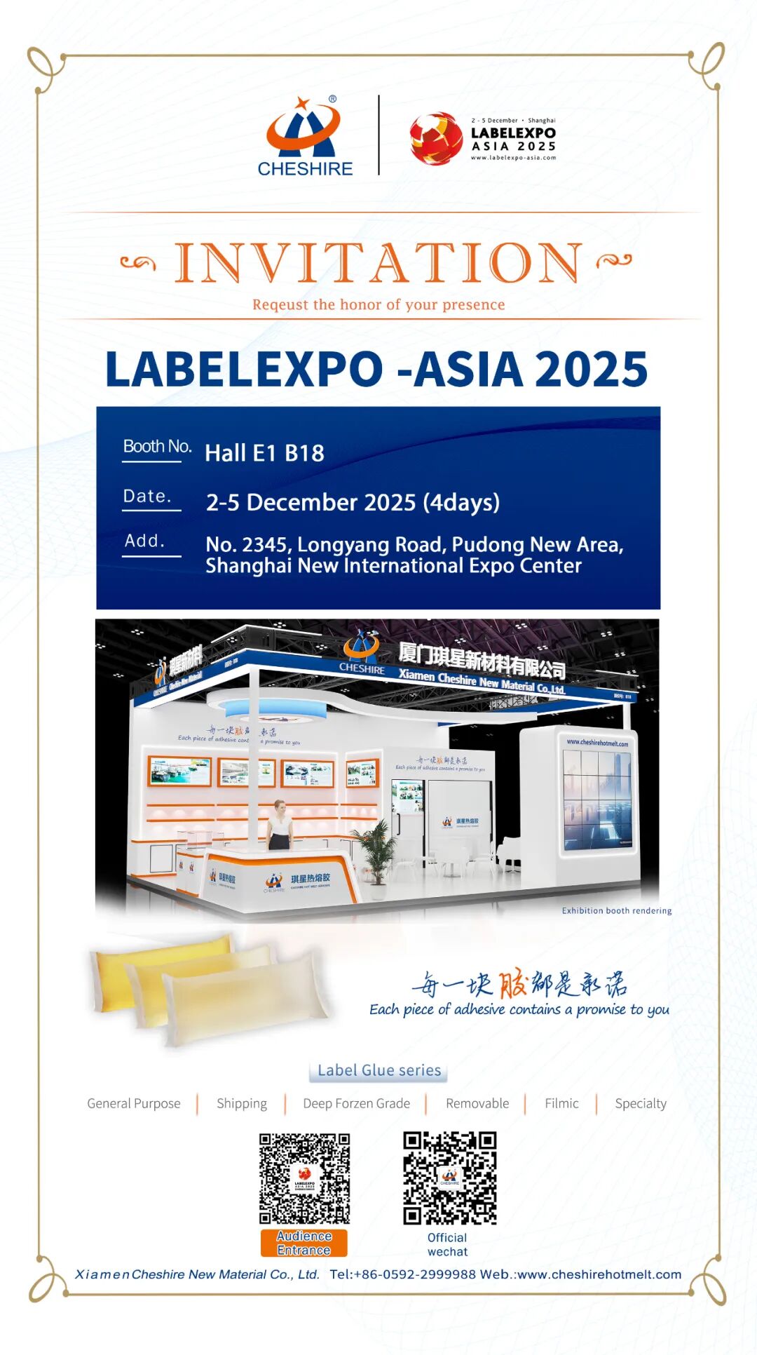 届时,琪星新材料公司将携领胶粘剂系列产品与技术解决方案盛情亮相,与业内先锋聚首一堂,解锁新材料前沿技术与应用。欢迎广大客商朋友莅临展位「上海新国际博览中心·E1号馆B18」参观交流,洞见数印标签智造未来。