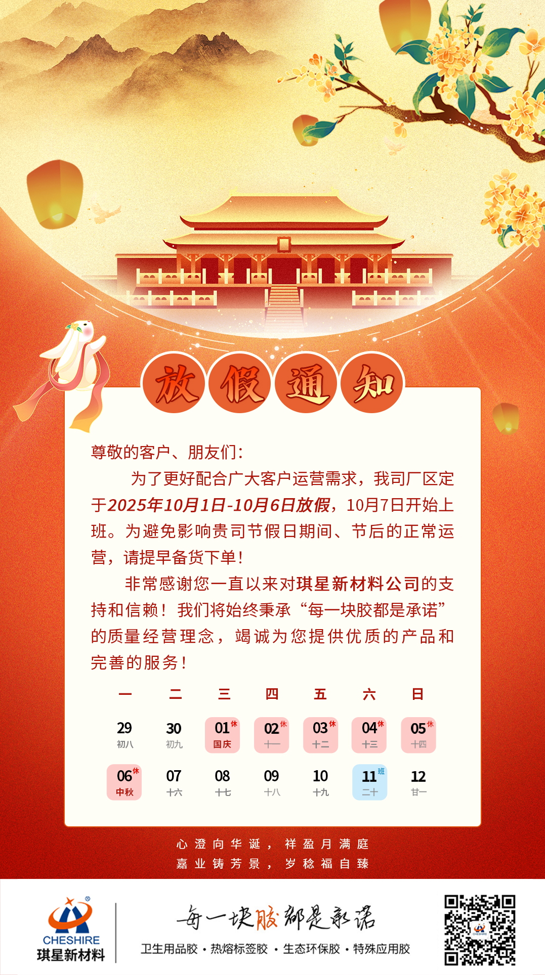 欢度|琪星新材料公司国庆节&中秋节放假通知